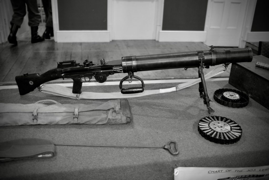 Following drill, we moved on to the main subject of the evening: the Lewis Gun. John delivered an excellent talk and demonstration, covering the history of the weapon and its particular importance to the Home Guard. Originally designed before the First World War, the Lewis went on to become one of the most recognisable light machine guns of both world wars, and its continued use into the 1940s made it a familiar sight with Home Guard units across the country.