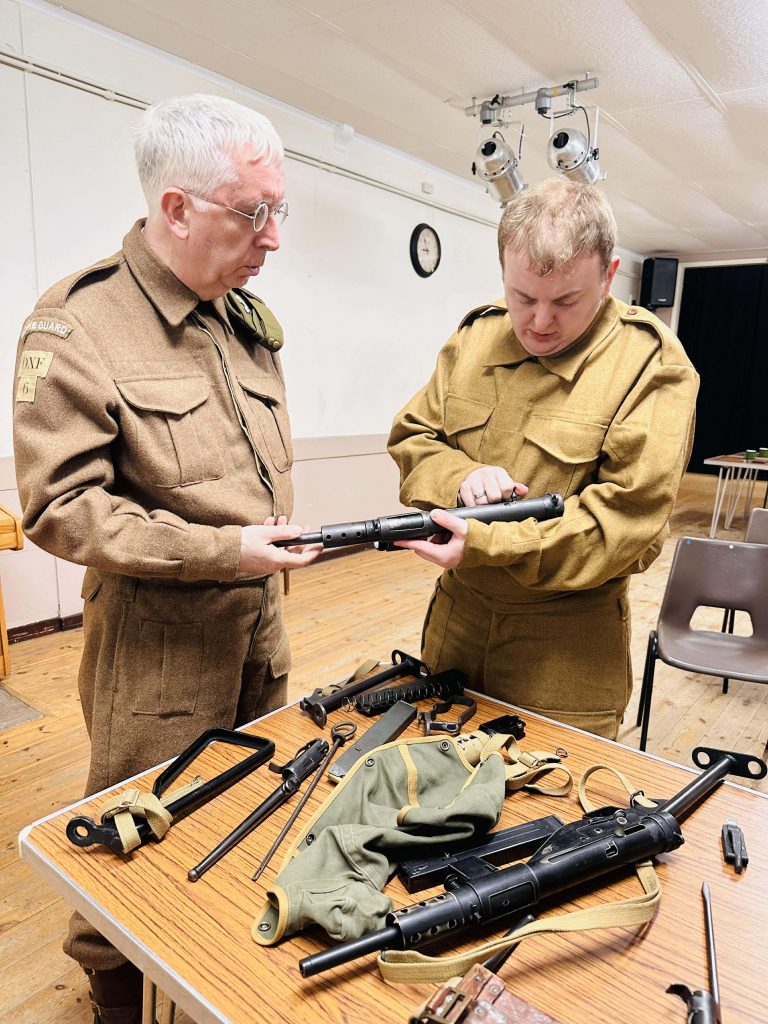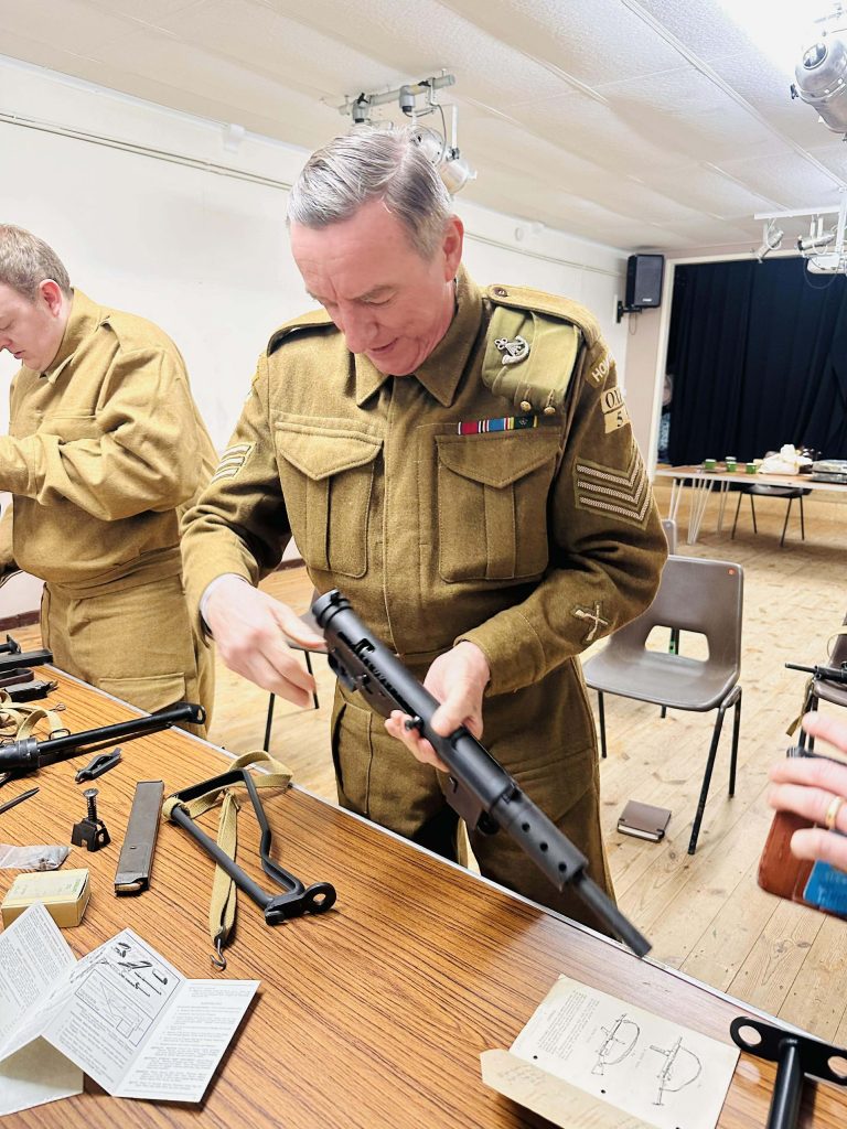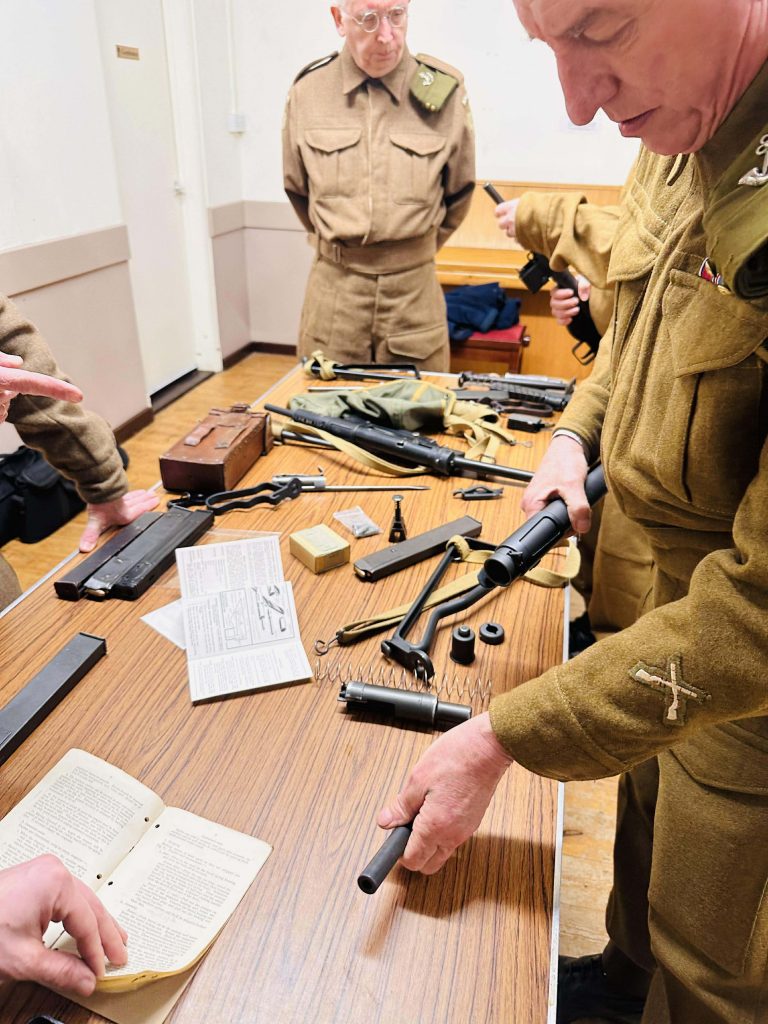 Following the film, 2/Lt Chambers and Pte Smith led a practical demonstration. They carefully walked through the principal components of the weapon, explaining the function of the bolt assembly and recoil spring, and outlining how the open bolt system operates. The session covered safe handling, field stripping and reassembly, along with discussion of magazines, ammunition and period accessories. Seeing the Sten broken down into its constituent parts reinforces how uncompromisingly functional the design is. It lacks the machining elegance of earlier firearms, yet its very simplicity was its strength at a time when Britain required rapid rearmament.